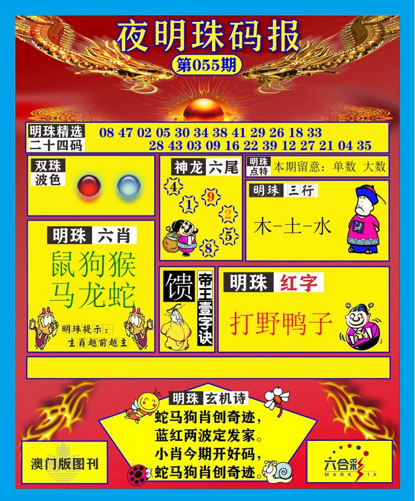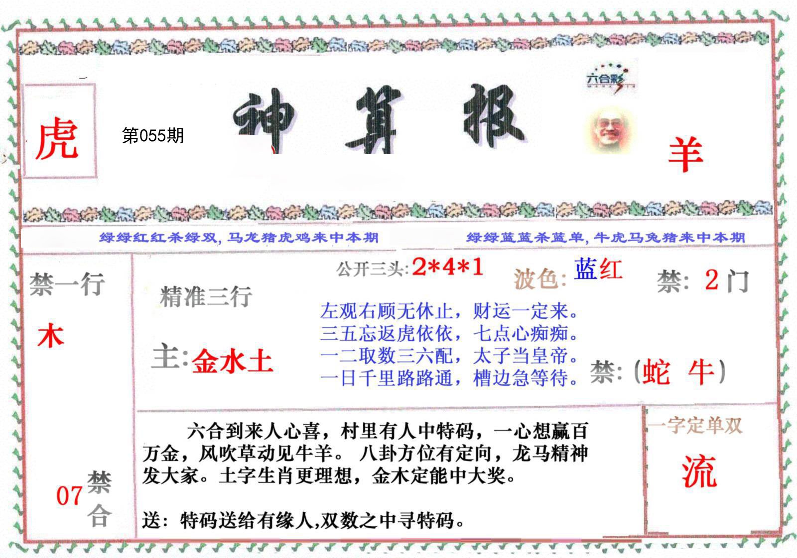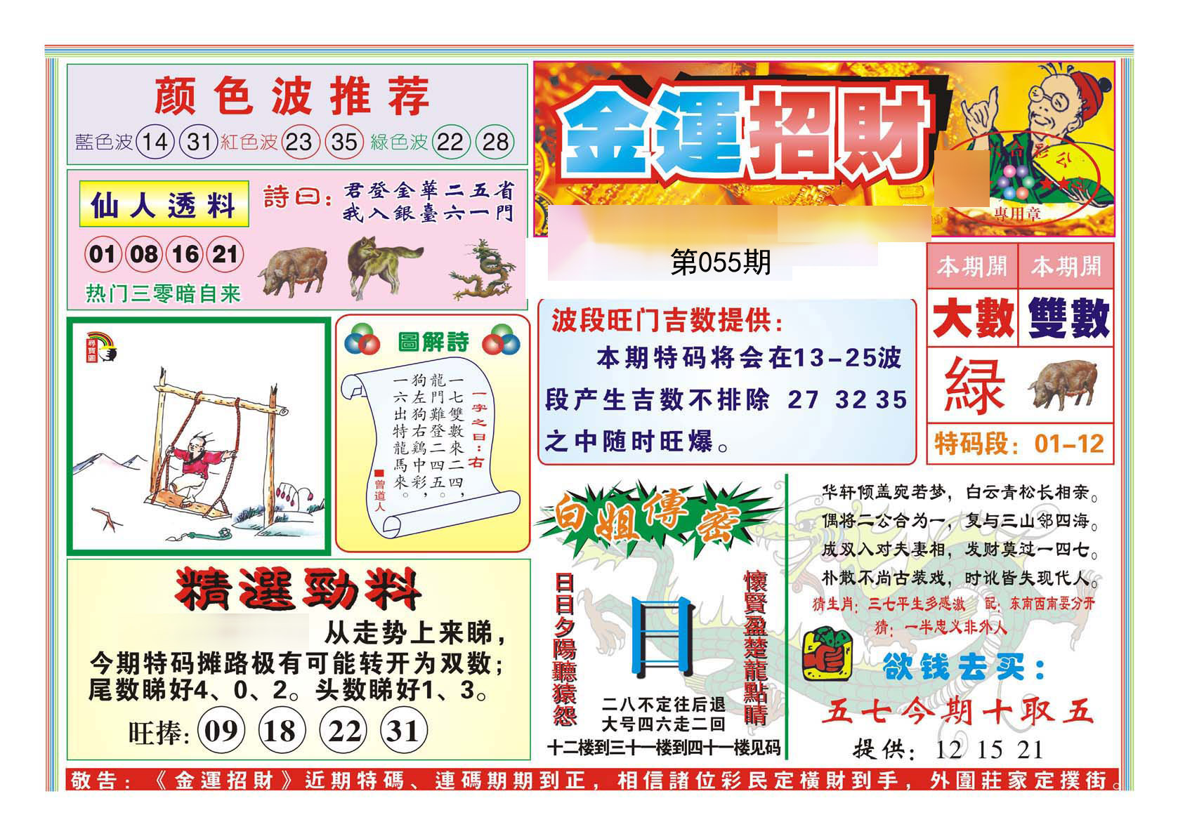 | 055期 财富波色:红蓝 开:?00 | |